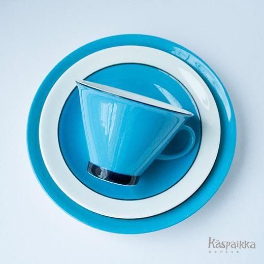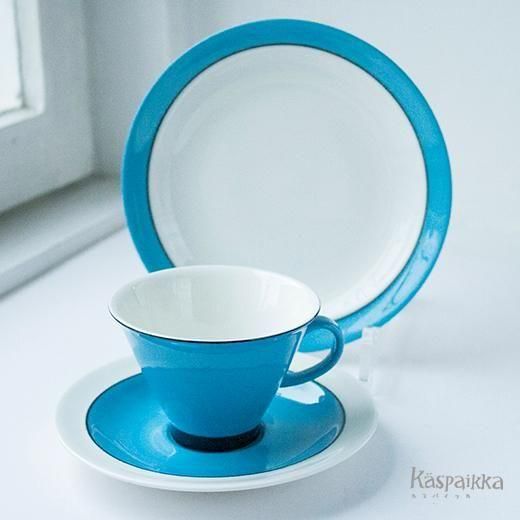 鮮やかなターコイズブルーが美しいArabia Harlekinのカップ&ソーサーとデザートプレートの3点セット・トリオです。Arabiaではあまり見かけないInkeri Leivo(インケリ・レイヴォ)が担当したILモデルの逆三角形フォルムは、すっきりとしたスタイリッシュな印象です。ネイビーのラインもアクセントになったこちらのカラーは、シンプルながらも小粋な配色が目を引きます。
