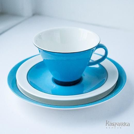 鮮やかなターコイズブルーが美しいArabia Harlekinのカップ&ソーサーとデザートプレートの3点セット・トリオです。Arabiaではあまり見かけないInkeri Leivo(インケリ・レイヴォ)が担当したILモデルの逆三角形フォルムは、すっきりとしたスタイリッシュな印象です。ネイビーのラインもアクセントになったこちらのカラーは、シンプルながらも小粋な配色が目を引きます。